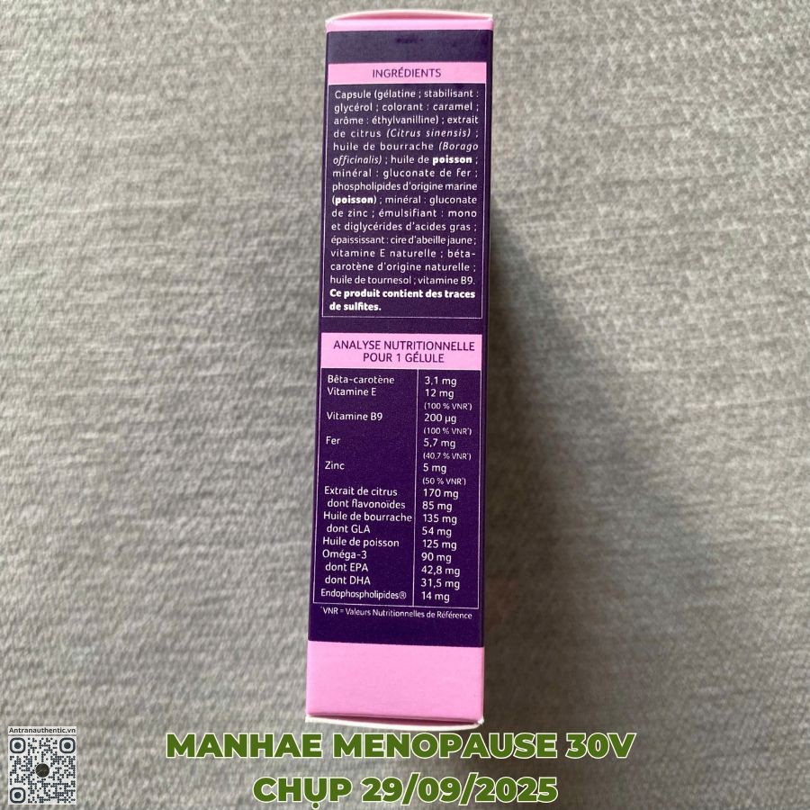 Manhae Menopause là viên uống nội tiết không chứa hormone, sản xuất tại Pháp, được nghiên cứu chuyên biệt dành cho phụ nữ bước vào giai đoạn tiền mãn kinh và mãn kinh. Sản phẩm hỗ trợ cải thiện các triệu chứng như bốc hỏa, khó ngủ, cáu gắt, khô hạn và mất cân bằng nội tiết – những biểu hiện phổ biến ảnh hưởng đến chất lượng sống của phụ nữ trung niên.
