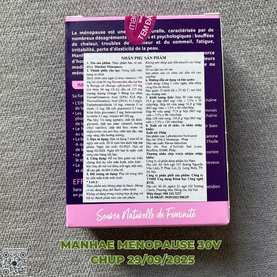 Tên sản phẩm: Thực phẩm bảo vệ sức khỏe Manhaé Ménopause