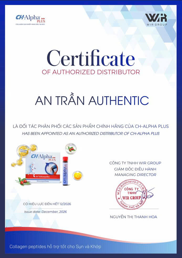 An Trần Authentic đã được Công ty TNHH WIR Group cấp chứng nhận là đối tác phân phối chính hãng các sản phẩm của CH-Alpha Plus tại Việt Nam. Giấy chứng nhận này có hiệu lực đến tháng 12/2025, khẳng định uy tín và sự hợp tác chính thức trong việc phân phối các sản phẩm hỗ trợ sức khỏe sụn và khớp. CH-Alpha Plus được biết đến với thành phần collagen peptides giúp hỗ trợ tốt cho sụn và khớp, được nhiều người tiêu dùng tin tưởng lựa chọn.