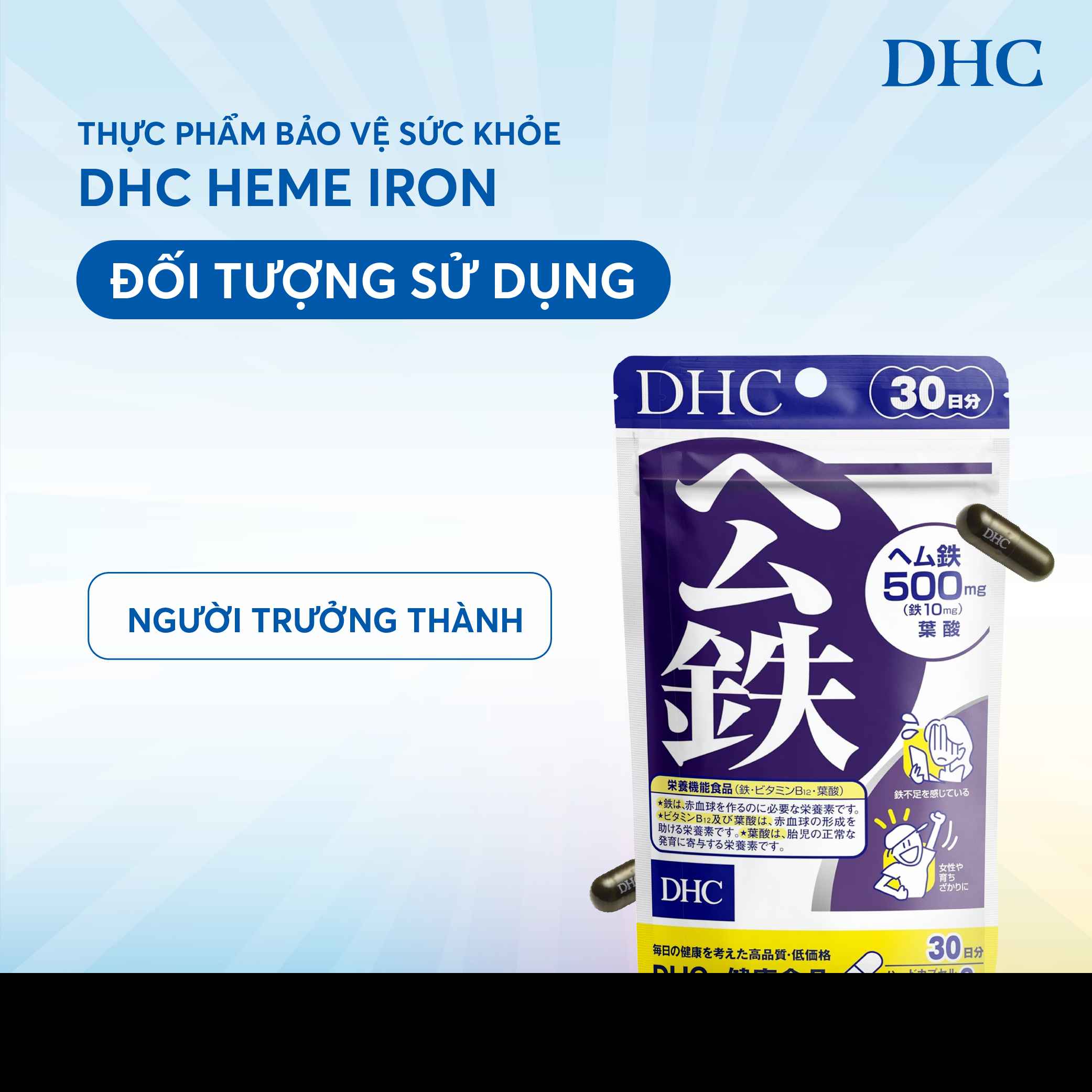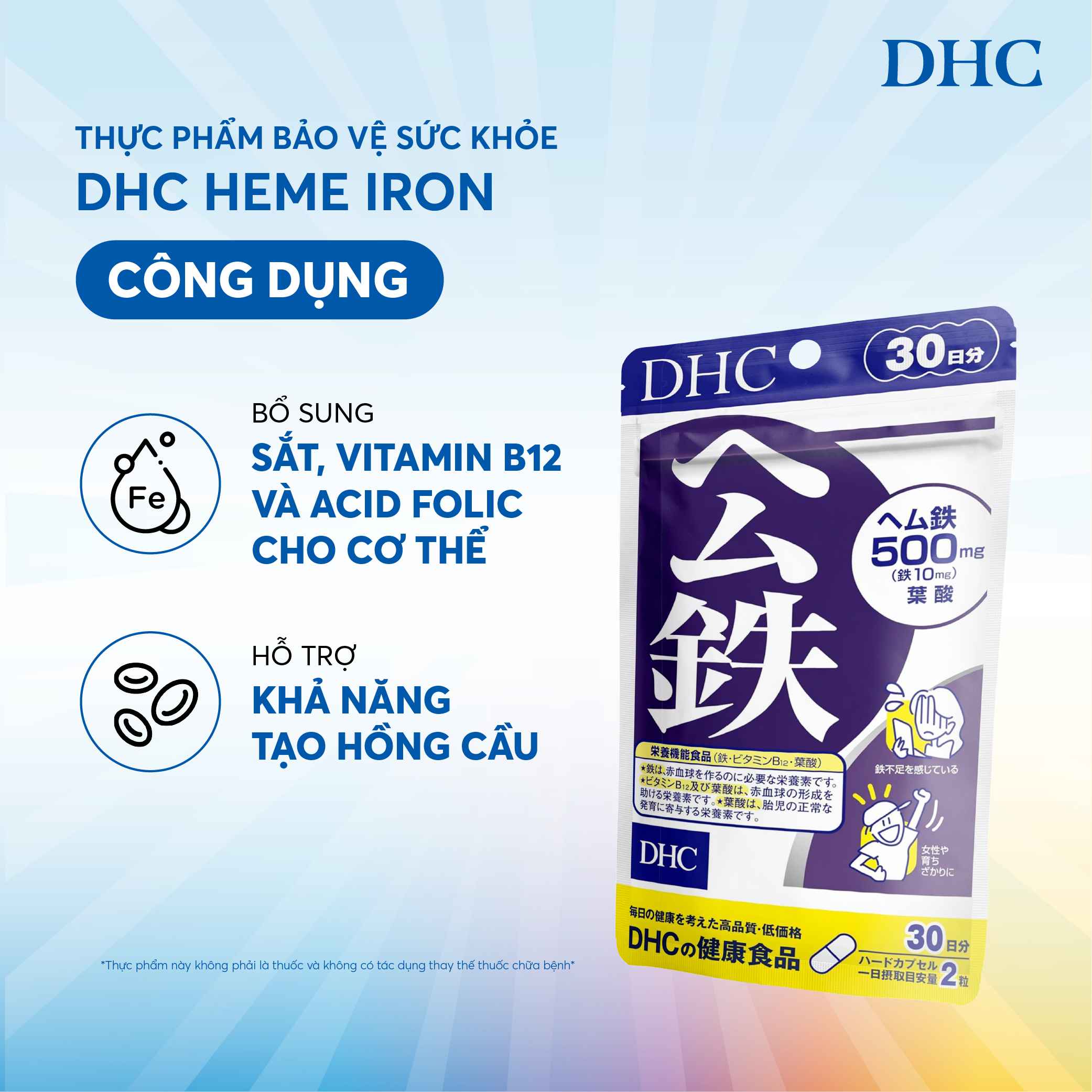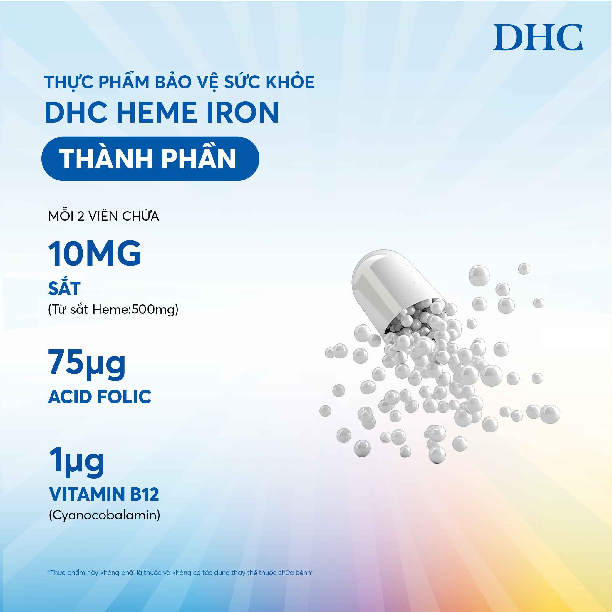 Không chỉ bổ sung sắt, DHC Heme Iron còn kết hợp vitamin B12 và acid folic (vitamin B9). Đây là bộ ba dưỡng chất quan trọng giúp hỗ trợ quá trình tạo máu. Cải thiện tình trạng thiếu máu, hoa mắt, chóng mặt và mệt mỏi kéo dài. Sản phẩm phù hợp cho phụ nữ, người thiếu máu do thiếu sắt, người ăn uống kém. Và cho phụ nữ trong kỳ kinh nguyệt, mẹ bầu cần bổ sung sắt mỗi ngày.