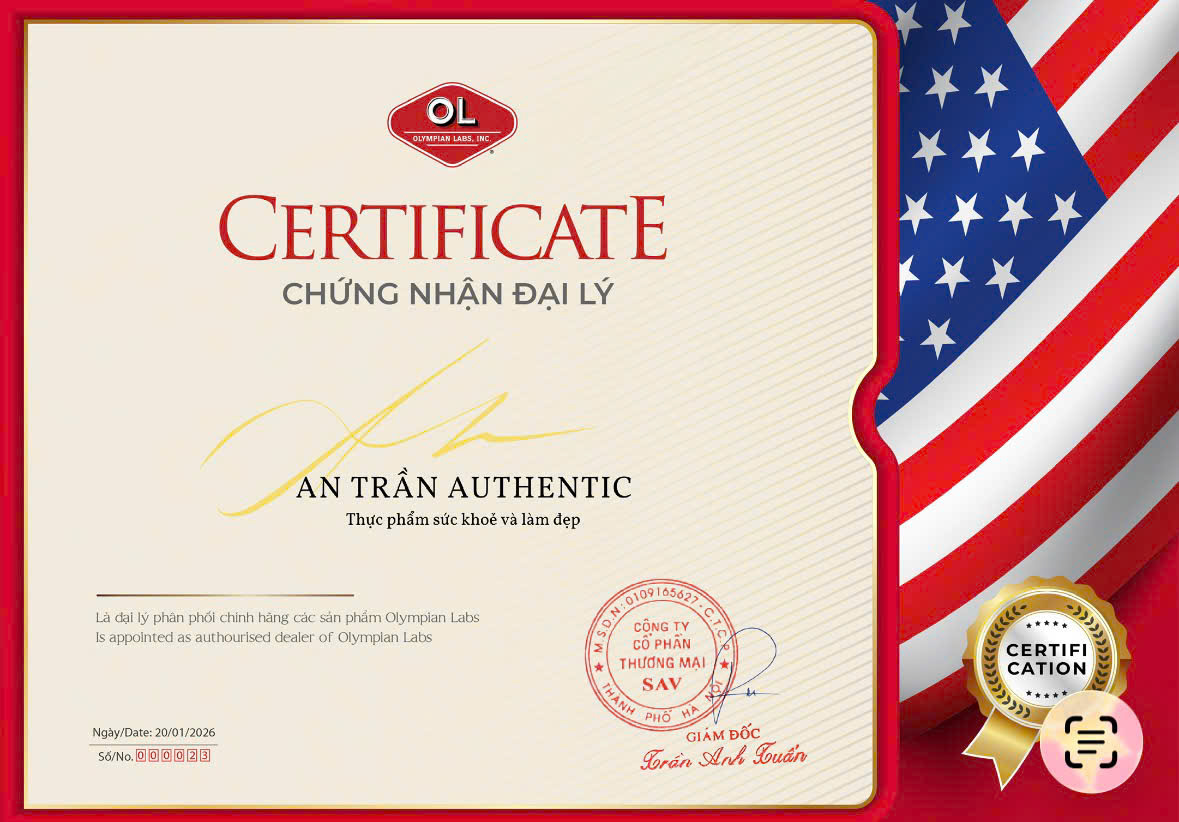 Giấy chứng nhận Đại lý chính hãng của Olympian Labs (Hoa Kỳ), xác nhận An Trần Authentic là đơn vị được ủy quyền phân phối các dòng sản phẩm chăm sóc sức khỏe của thương hiệu Olympian Labs tại Việt Nam.