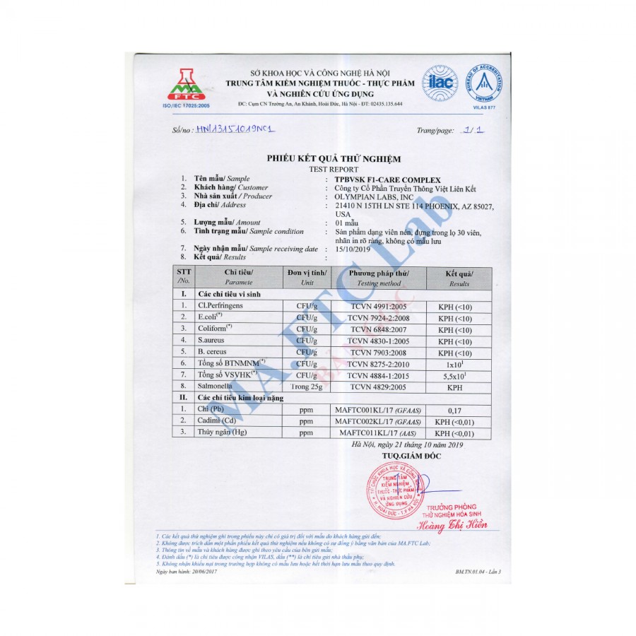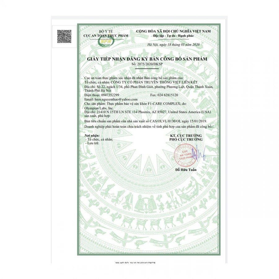 Các sản phẩm, trong đó có F1-Care Complex Olympian Labs, đều được sản xuất trong nhà máy đạt chuẩn GMP và CGMP, kiểm định bởi NSF International – tổ chức uy tín hàng đầu thế giới về đánh giá chất lượng và an toàn.