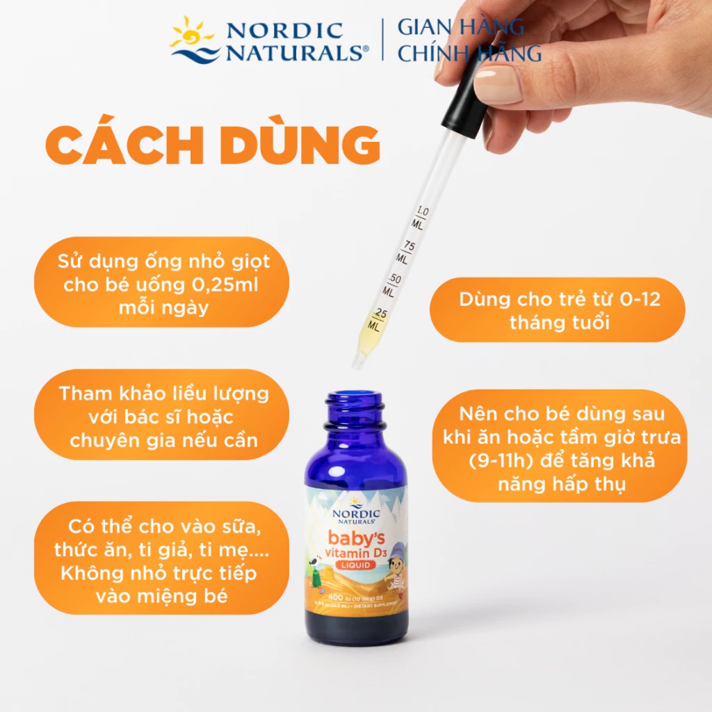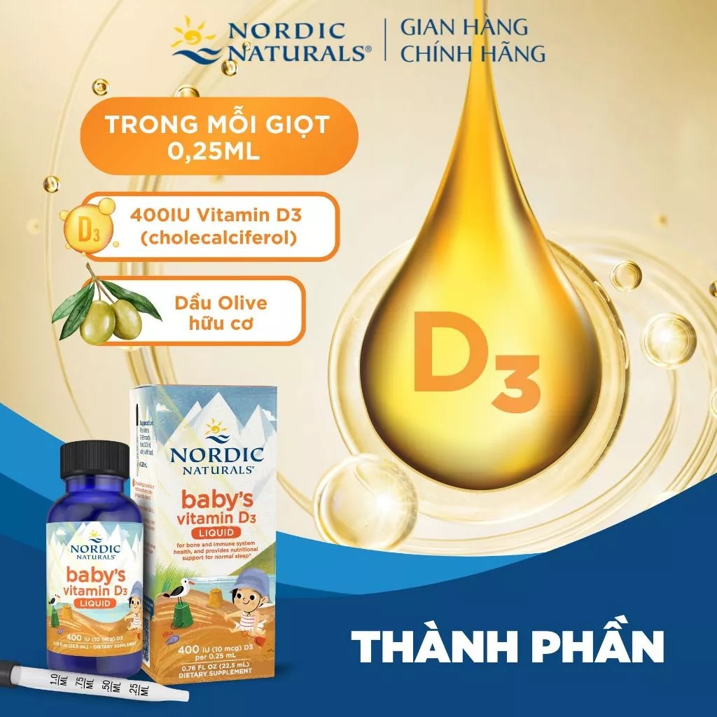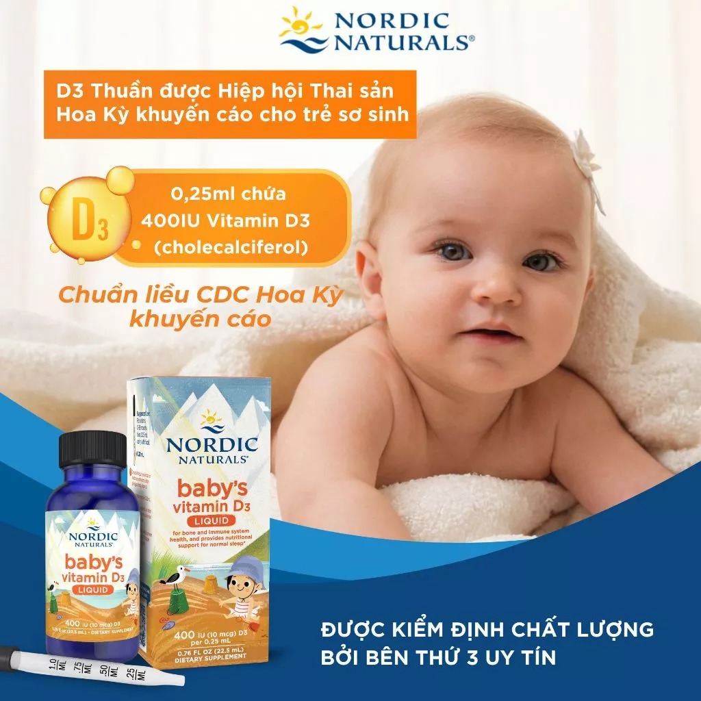 Vitamin D3 Nordic Naturals là sản phẩm bổ sung Vitamin D3 dành cho bé từ 0-12 tháng. Được Hiệp hội Thai sản Hoa Kỳ công nhận là vitamin D chính thức dành cho trẻ em. Với công thức tinh khiết, dễ hấp thu, sản phẩm hỗ trợ quá trình hấp thu canxi. Góp phần xây dựng hệ xương, răng và cơ bắp chắc khỏe ngay từ những năm đầu đời. Vitamin D3 Nordic Naturals giúp trẻ phát triển thể chất toàn diện, tạo nền tảng vững chắc cho tăng trưởng lâu dài.