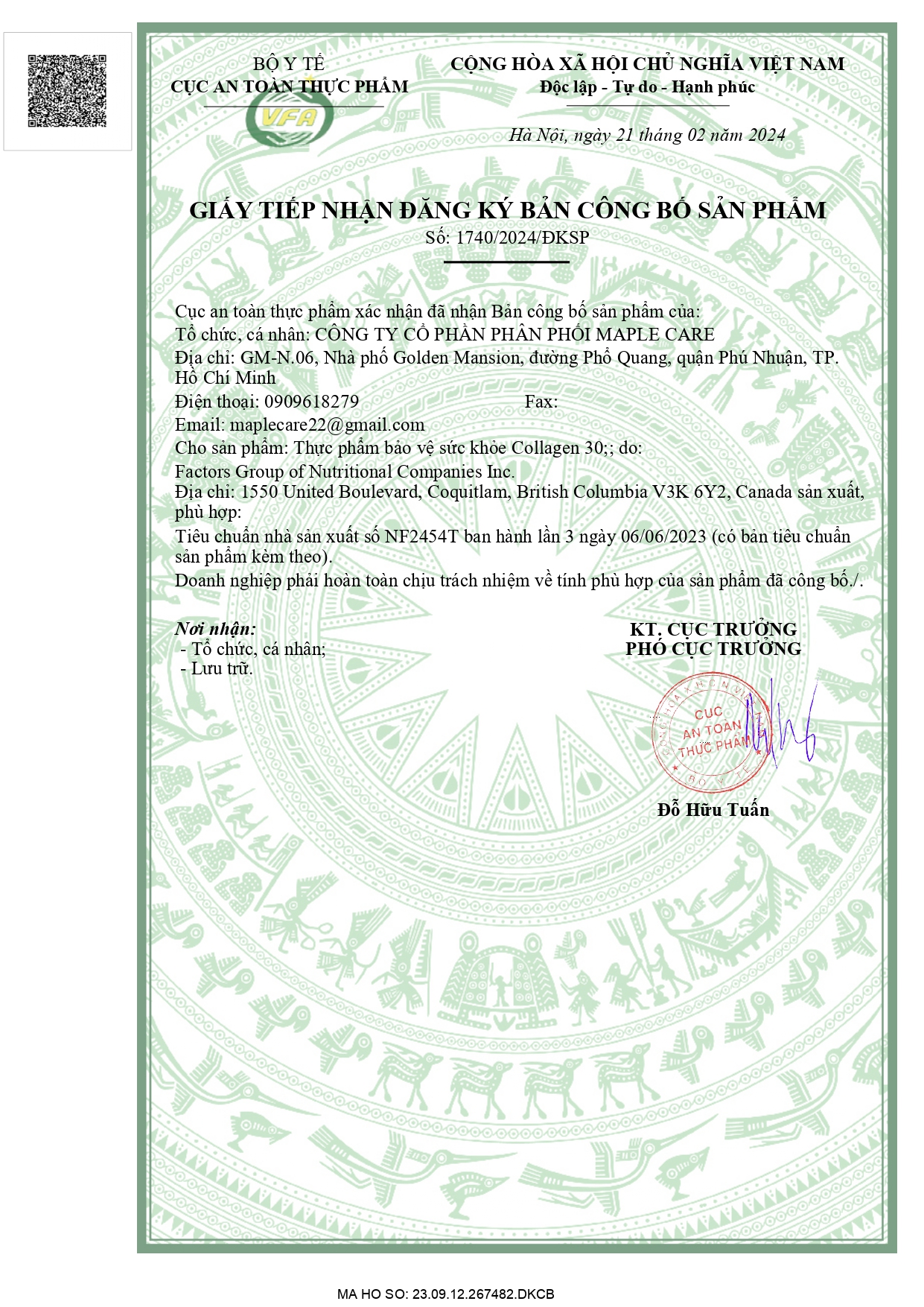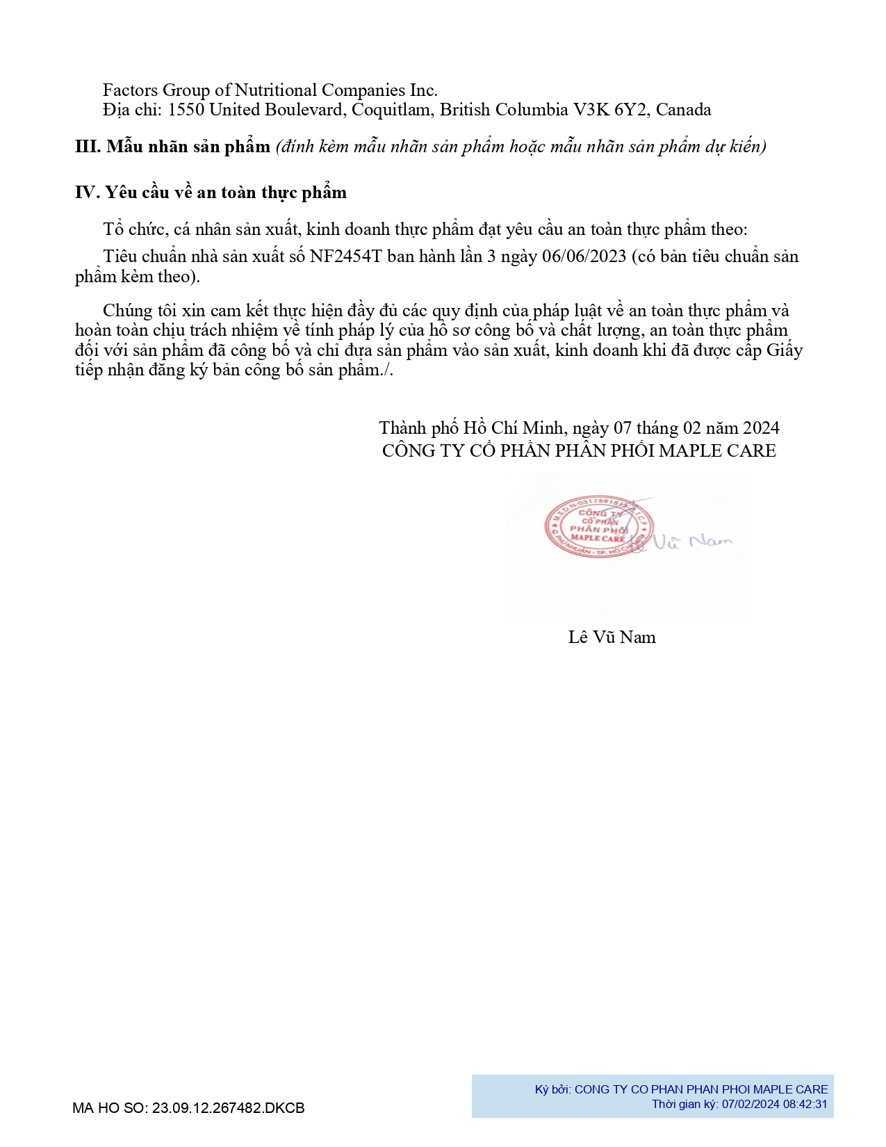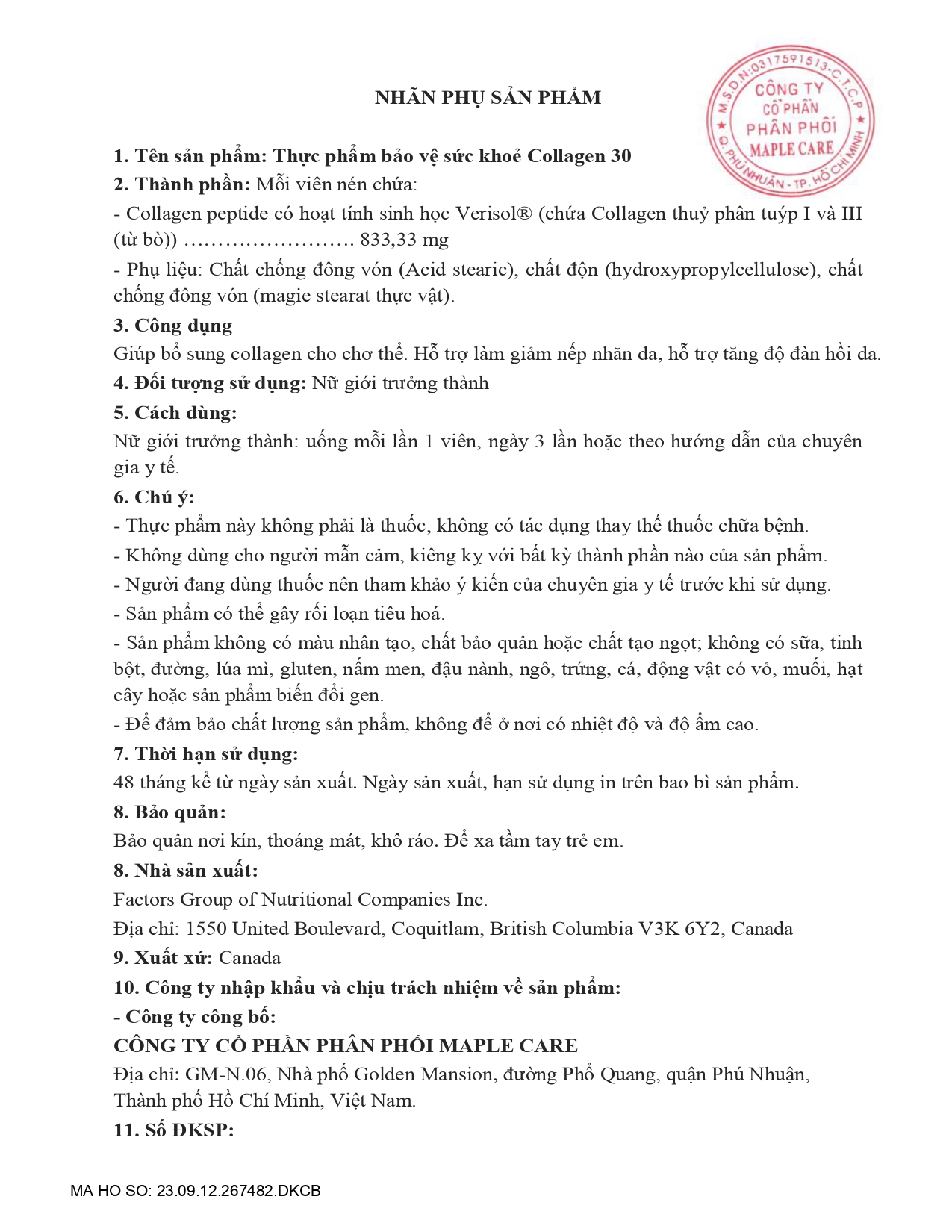 Công ty nhập khẩu và chịu trách nhiệm về sản phẩm: CÔNG TY CỔ PHẦN PHÂN PHỐI MAPLE CARE