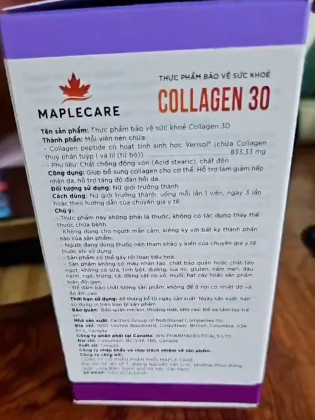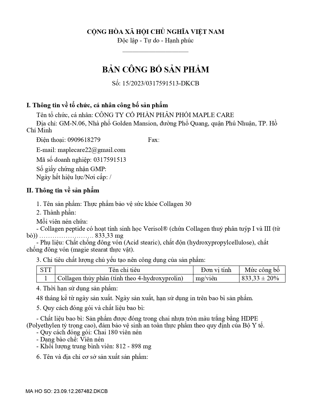 Tên sản phẩm: Thực phẩm bảo vệ sức khỏe Collagen 30